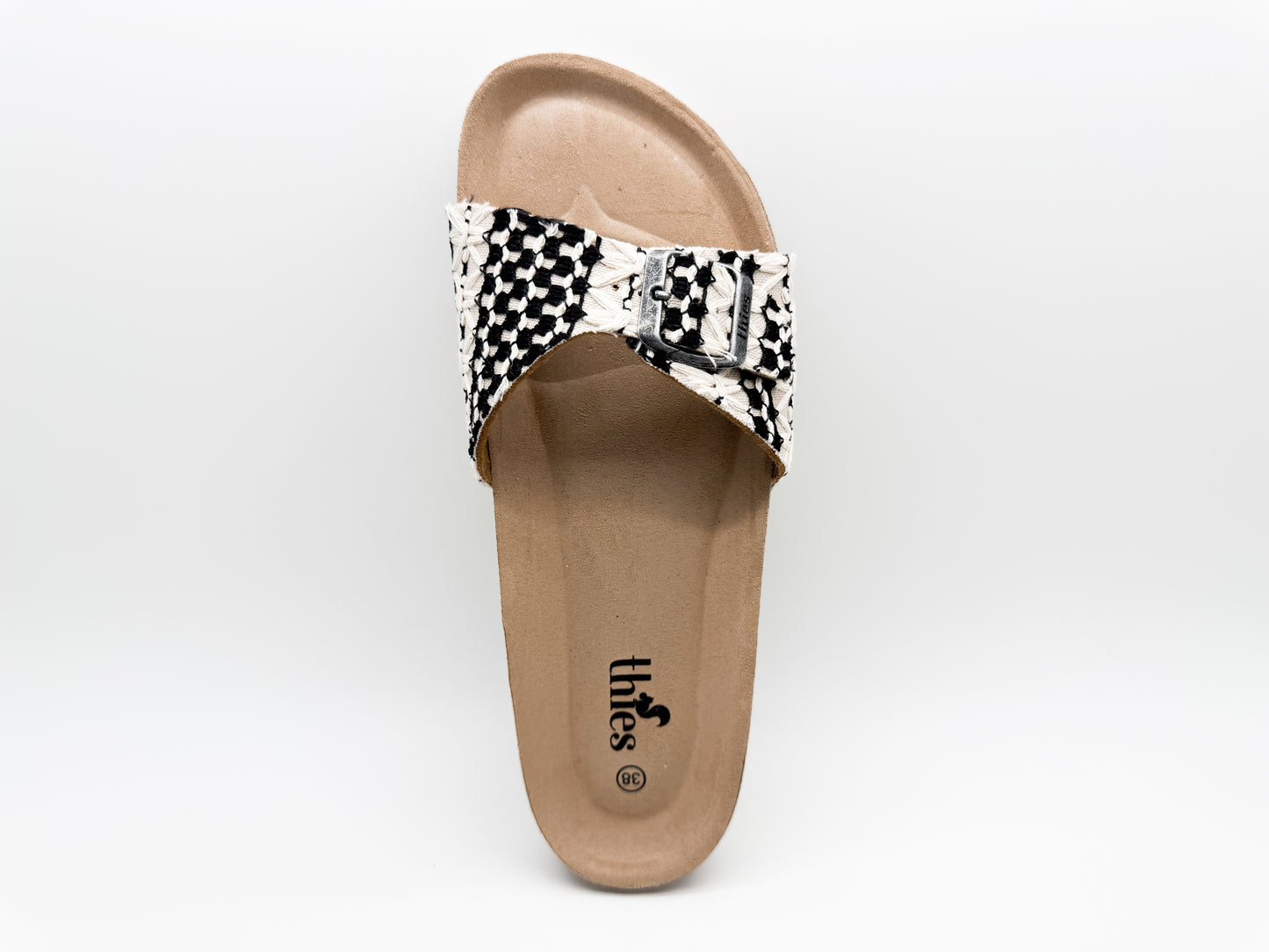 The vegan Eco Boho Strap Sandals by thies ® are made from recycled cotton. The lining is made of soft PES, meaning recycled poliester and and the cushioned insole is made of recycled PES. The sandals are, ultra-light, the outsole is made of recyclable cork and has no annoying seams. Ergonomically shaped, soft deep footbed. The shoe is ideal and even great to wear barefoot! The innovative material can hardly be distinguished from real leather in terms of feel, appearance and performance.