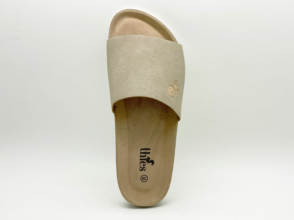 The vegan Eco Pool Slide Sandals by thies ® are made of the supersuede leather alternative. The lining is made of soft PET, meaning recycled post-consumer PET bottles and and the cushioned insole is made of recycled PES. The sandals are unisex, ultra-light, the outsole is made of recyclable cork and has no annoying seams. Ergonomically shaped, soft deep footbed. The shoe is ideal for all seasons and even barefoot! The innovative material can hardly be distinguished from real leather in terms of feel, appearance and performance.