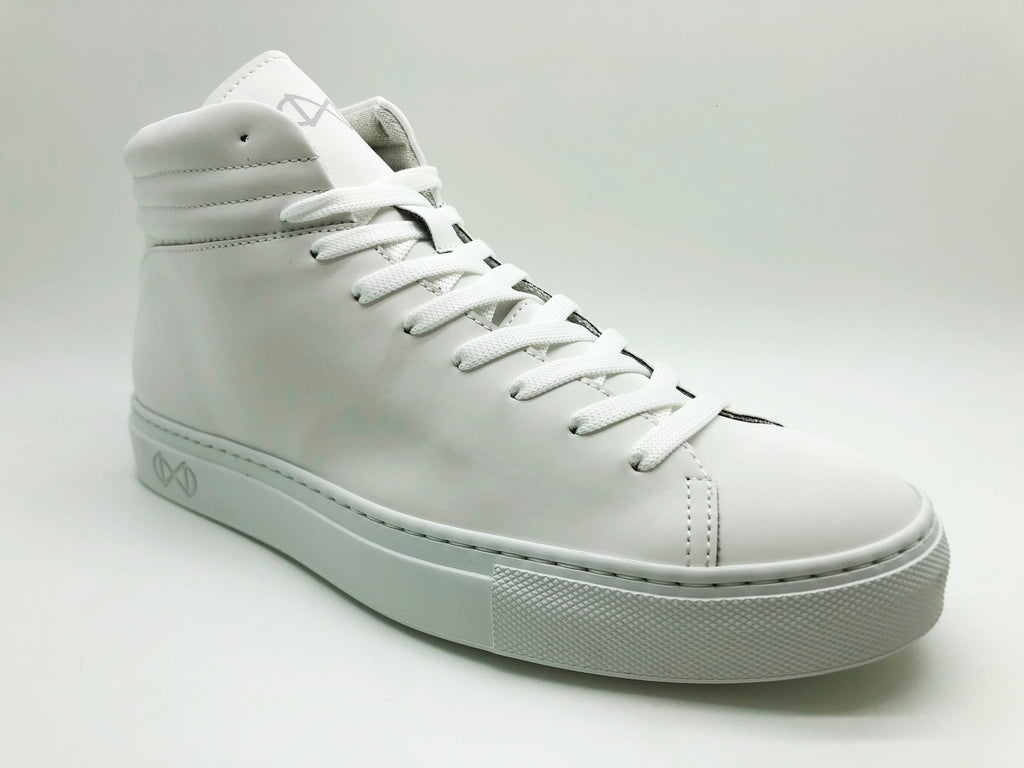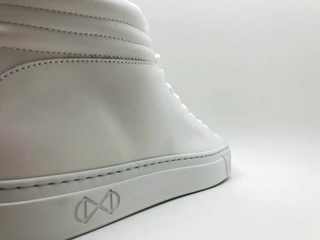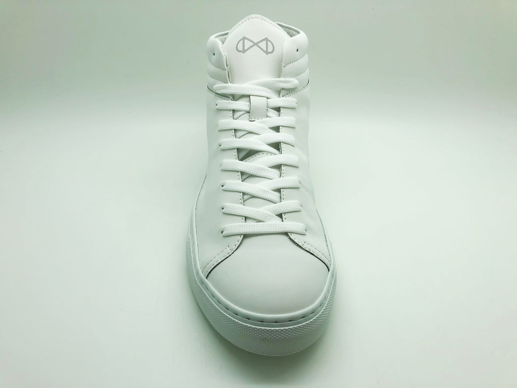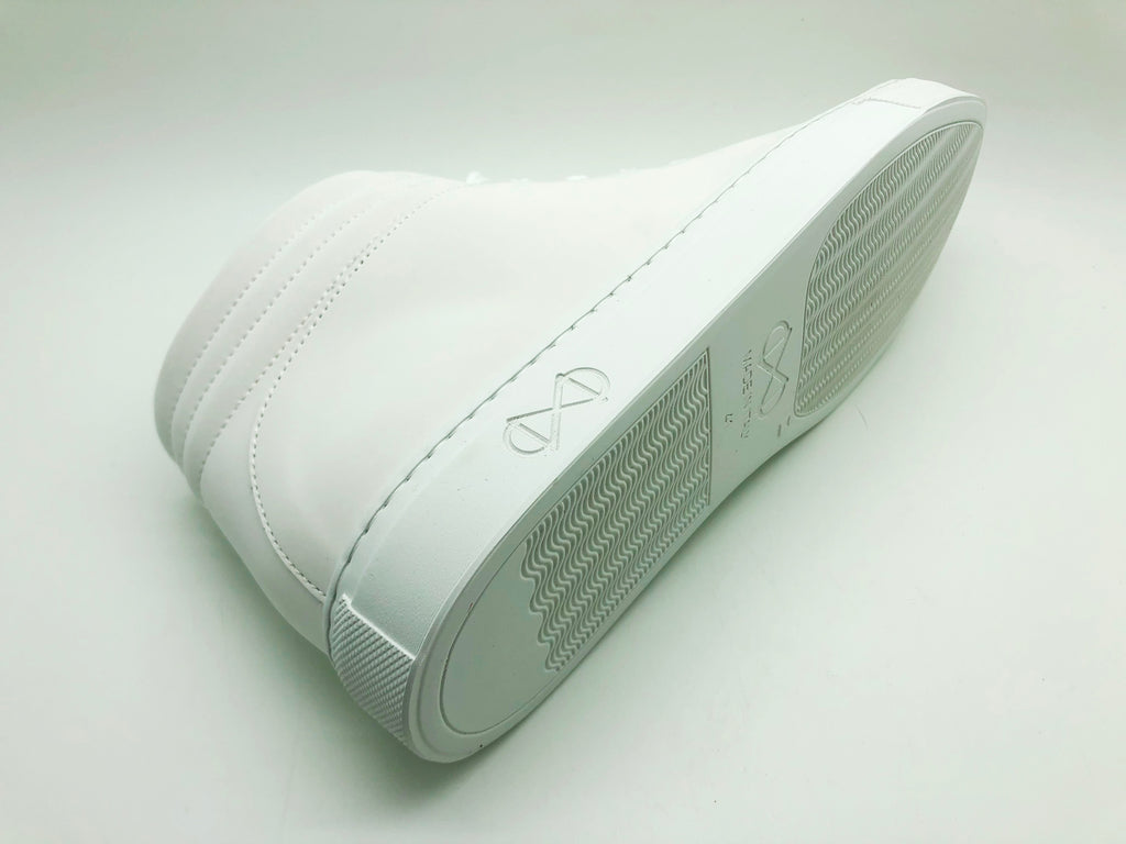 The vegan Sleek version. The ultimate timeless luxury sneaker. The nat-2™ Sleek is produced under fair conditions in a small family production in Italy. The style is a unique timless classic mostly in clean white only with a changing back heel. The used white glass surface [ 3M ® ] is the finest and smoothest available. The shoe also features a real cork removable insole.
