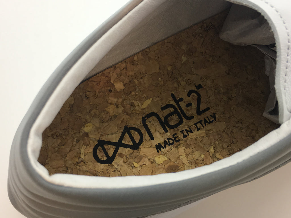 The ultimate timeless luxury sneaker. The nat-2™ Sleek is produced under fair conditions in a small family production in Italy. The style is a unique timless classic mostly in clean white only with a changing back heel. The used italian nappa leather is the finest and smoothest available. The shoe also features a real cork removable insole.