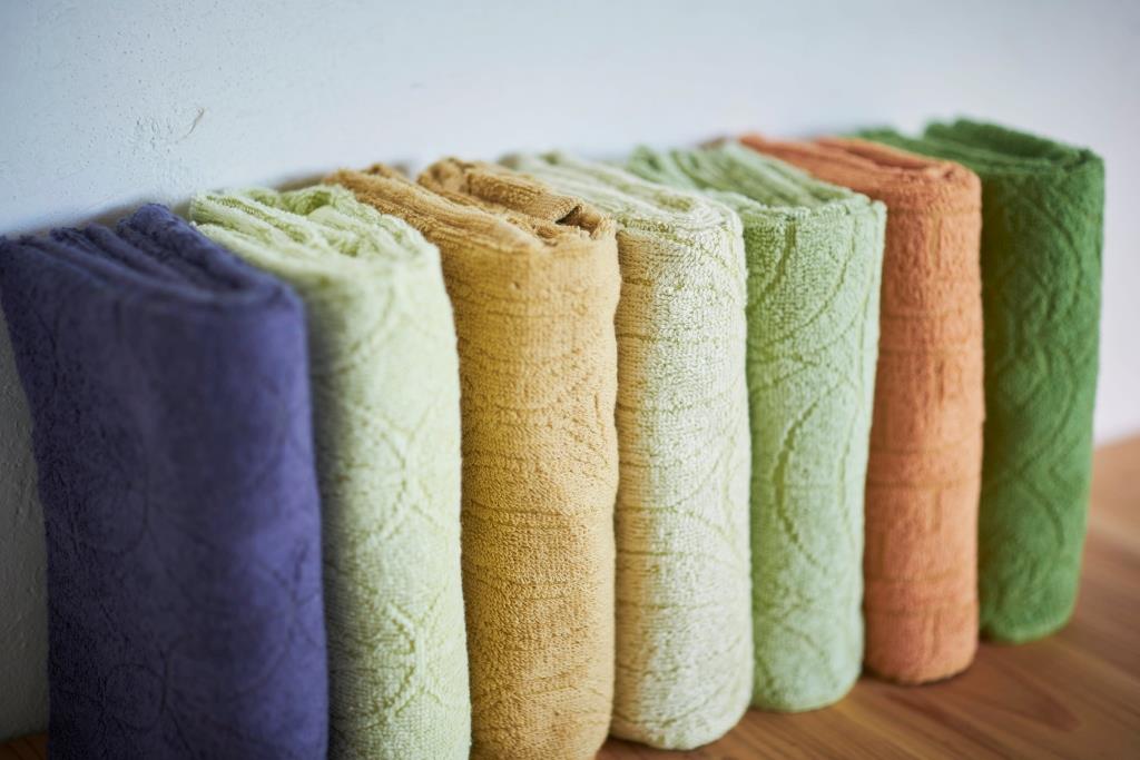 The absorbent Shizuku Towel collection made using natural dyes as resource recycling from freshly grown local vegetables with slight imperfections that would otherwise end up in waste.