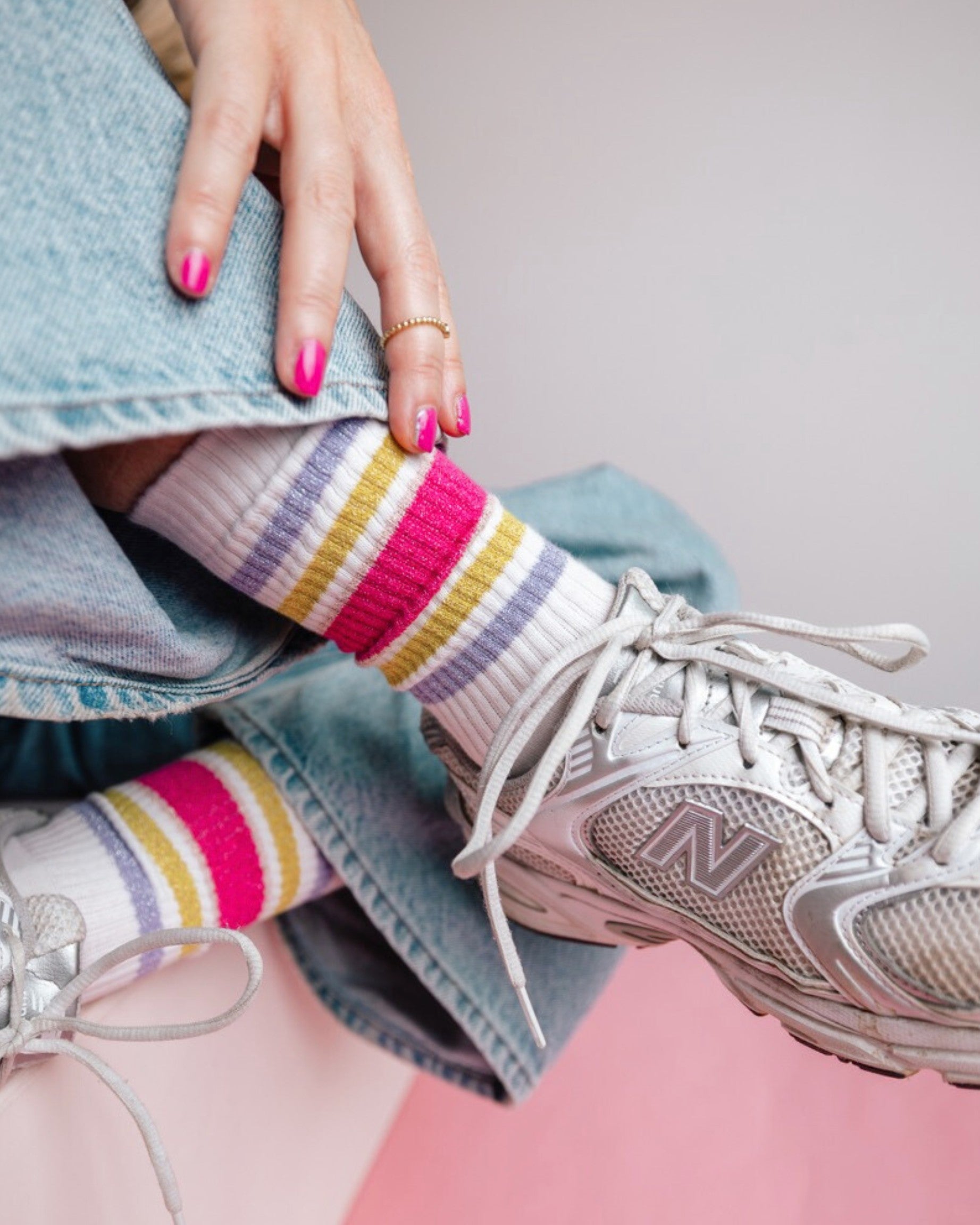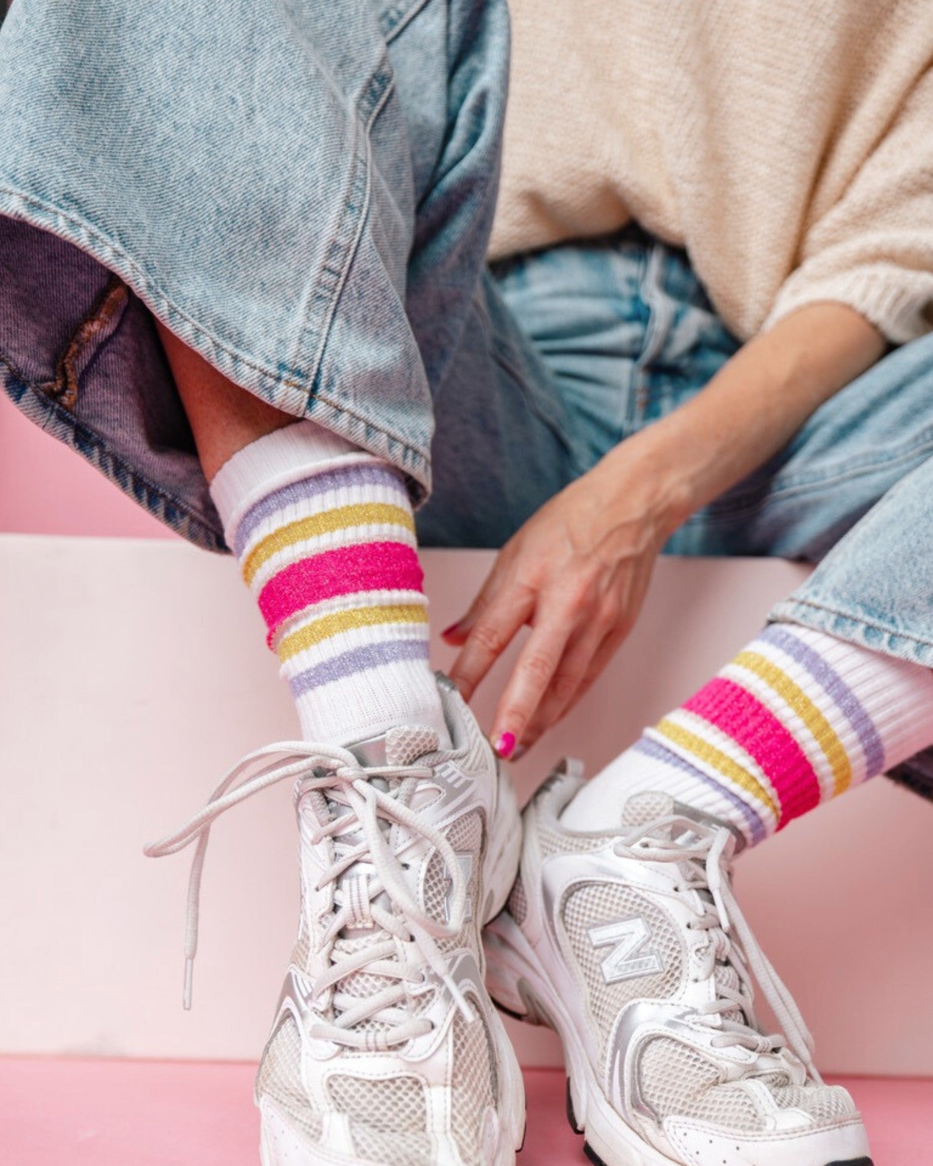 Die SPORTY GLITTER Socken vereinen glänzende Highlights mit weicher Plüschsohle und sportivem Schnitt. Das Ergebnis: Ein Fashion-Piece, das mit jedem Schritt auffällt – und dabei herrlich bequem bleibt.